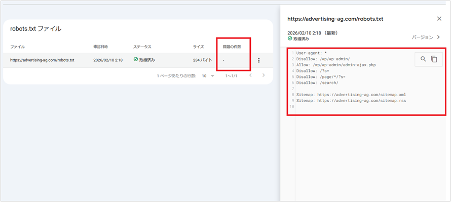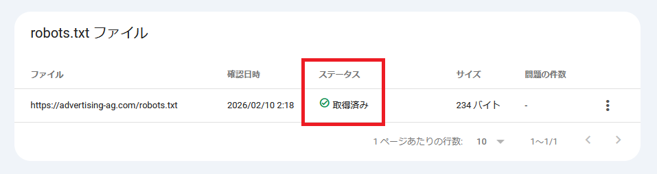 ステータスが「取得済み」になっていればGoogleのクローラーはrobots.txtを正常に取得できています。