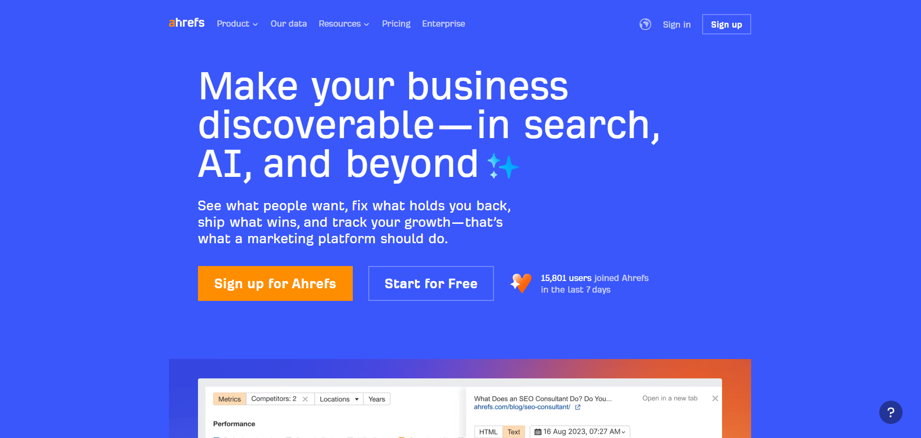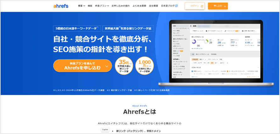 SEOのツールで有名なahrefsのh1タグは、<h1>Make your business discoverable—in search, AI, and beyond</h1>(訳:検索、AI、その他の手段でビジネスを見つけやすくしましょう)と書かれており、マークを入れるなど面白い使い方をしています。なお、日本語サイトではh1タグにロゴ画像を設定していました。