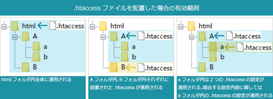 .htaccessは「置いた場所より下のフォルダに効く」ため、サイト内に複数設置することができます。