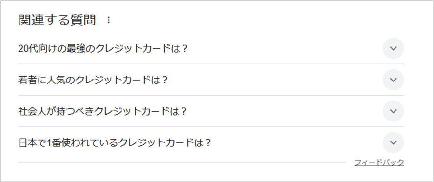 試しに「クレジットカード 20代 おすすめ」とGoogleで検索すると「関連する質問」には以下のような質問が表示されます。