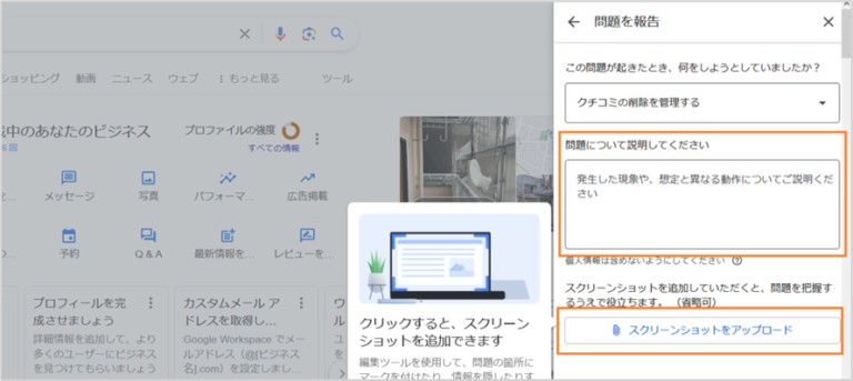 Googleビジネスプロフィールの管理画面から口コミの削除申請をおこなうと、より詳細なフィードバックをGoogleに送ることができます。