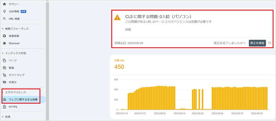 Google Search Console の「エクスペリエンス」の中にある「ウェブに関する主な指標」レポートからWebサイト内にあるページに表示速度に関する問題が発生しているか確認できます。