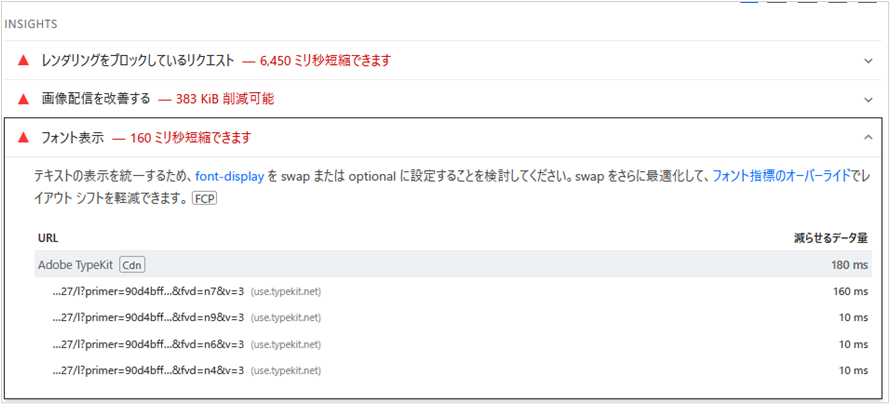 「パフォーマンスの問題を診断する」内にある「Insights」や「診断」の欄に、具体的な改善方法が表示されます。