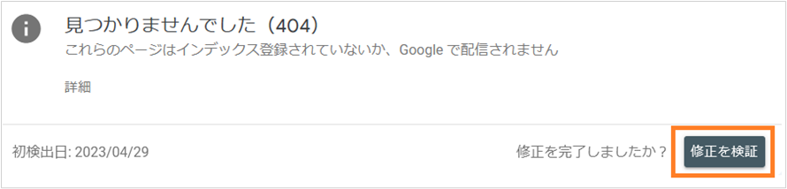 ページを復元もしくは301リダイレクトを行い、インデックス申請をしたら、インデックスレポートで「見つかりませんでした(404)」を開き「修正を検証」をクリックしましょう。